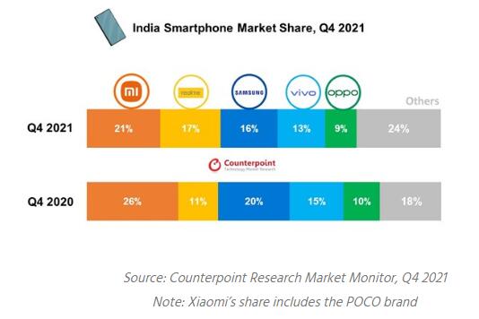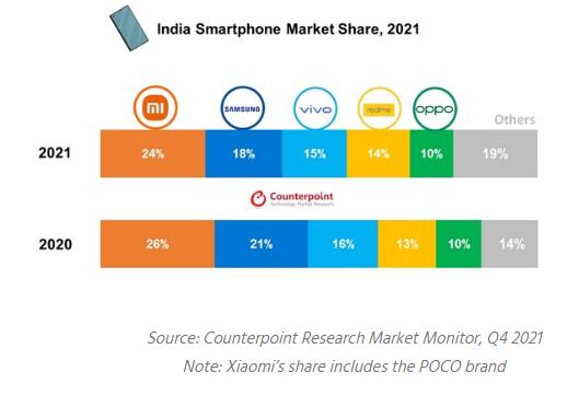 The annual shipments of smartphone in India grew 11% year-over-year (YoY) to the highest ever 169 million in 2021, and Xiaomi maintained the top place with a shipment share of 24%, trailing Samsung’s 18% share, according to the technology market research firm Counterpoint Research.